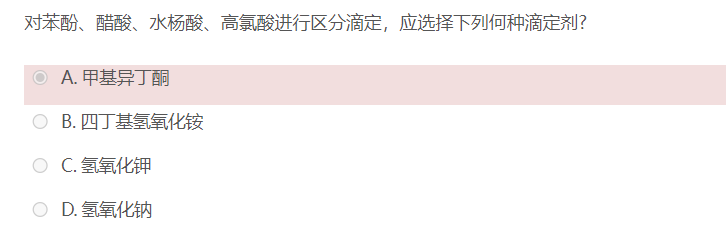 回复裴子睿3210060002 回复: 这什么意思啊酸不是酸的区分剂吗。。。。为啥答案里面要用强碱。。。 王清昆3210405053 - 2022年04月21日 星期四 21:14 他问的是滴定剂,滴定需要的是强碱,四个选项中,四丁基氢氧化铵是最强的碱,注意区分滴定剂还是溶剂,区分效应和拉平效应是相对于溶剂来说的。 永久链接 显示父帖