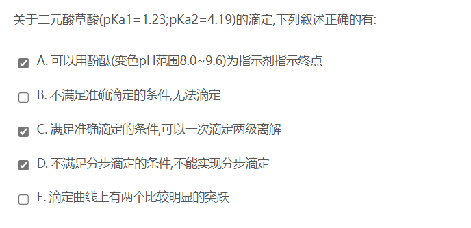 就这题我不理解为啥可以用酚酞做指示剂。。。两次滴定终点都是酸性的啊。。。 裴子睿3210060002 - 2022年04月20日 星期三 11:50 回帖数:1 永久链接 回复裴子睿3210060002 回复: 就这题我不理解为啥可以用酚酞做指示剂。。。两次滴定终点都是酸性的啊。。。 杨正浩3210060013 - 2022年05月25日 星期三 22:11 可以看一下教材53页,用NaOH滴定草酸突跃范围在6-11左右 永久链接 显示父帖