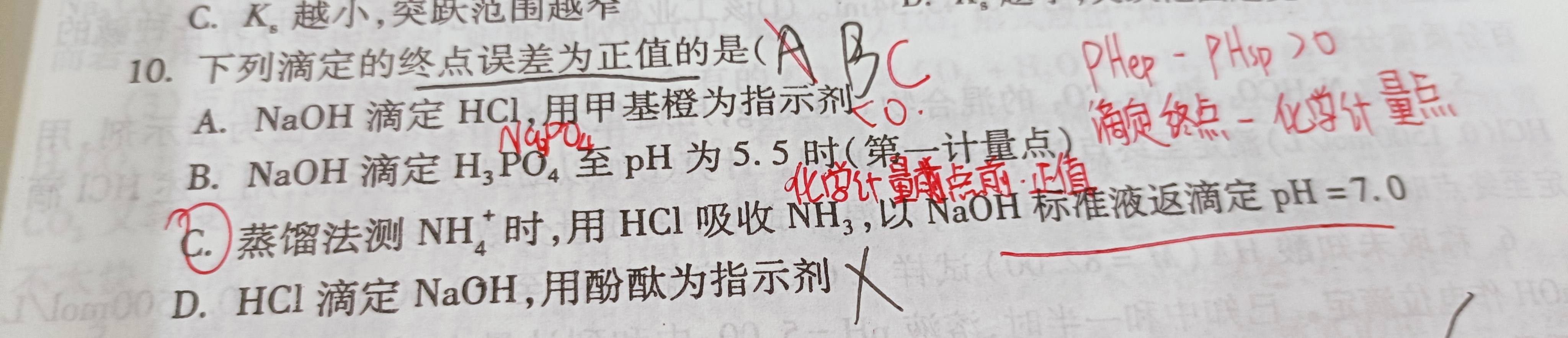 终点误差正负判断 by 3210405042 罗佳敏 - Tuesday, 26 April 2022, 2:17 PM Number of replies: 1 老师这个C为什么是对的? Permalink In reply to 3210405042 罗佳敏 回复: 终点误差正负判断 by 057029 张勇 - Saturday, 30 April 2022, 11:49 PM 详见教材蒸馏法测铵离子。计量点时,溶液为 NaCl + NH4Cl ,氯化钠中性,氯化铵溶液弱酸性,因此计量点为弱酸性,若滴定到中性7.0,则表明NaOH加入量超过了计量点,所以是正误差。 Permalink Show parent