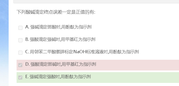 回复张力文3210405043 回复: 不太理解为什么D无法确定正还是负 邓丽蓉3210405047 - 2022年05月24日 星期二 10:02 强酸滴定弱碱,比如说盐酸滴定氨水,会生成氯化铵,铵根离子水解显酸性,甲基红的变色范围是4.2-6.3,铵根离子水解会使其变色,但是不能确定盐酸是滴多了还是滴少了 永久链接 显示父帖