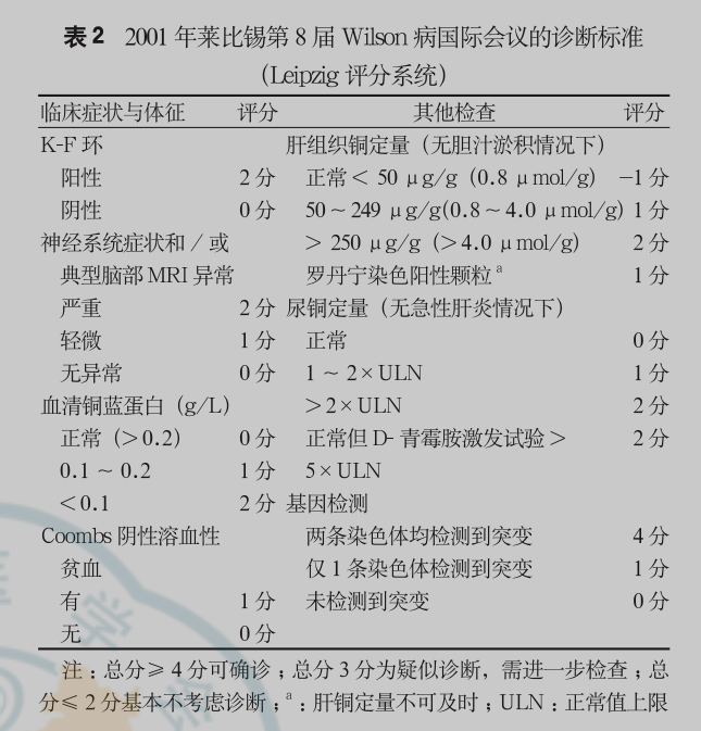 对于存早任何不明原因肝病表现、神经症状(尤其是锥体外系症状)或精神症状的患者,均应考虑WD可能。我国2022年版肝豆状核变性诊疗指南推荐应用2001年莱比锡第8届WD国际会议的诊断标准,总分≥4分可确诊,3分为疑诊,≤2分为排除性诊断。