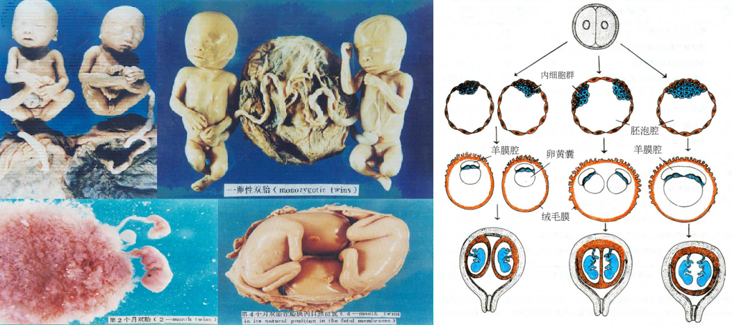 - 单卵双胎:由一个受精卵在发育过程中发生分离并形成两个独立的胎儿,称单卵双胎。两个胎儿的性别相同,出生后的相貌、体态等遗传特征都相同。由于发生分离的时期不同,双胎或各有独立的胎膜和胎盘,或共有一个胎膜和胎盘。