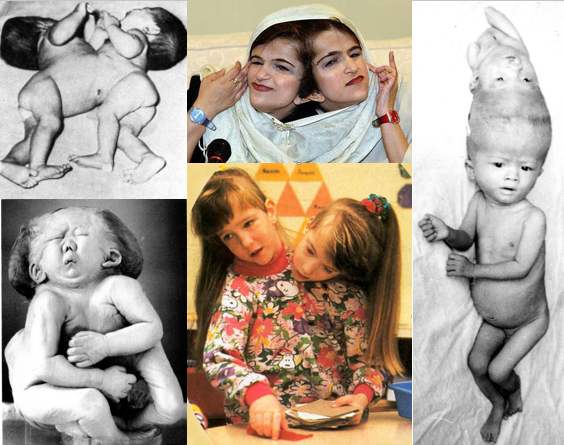 - 联体双胎:来自两个未完全分离的单卵双胎。一个胚盘出现两个原条,并分别发育形成两个胚胎,但两个胚胎未完全分开,胚体的某一部分不同程度的联在一起,例如头联双胎、臀联双胎、胸联双胎或腹联双胎。如果联体双胎中有一个胎儿很小,且发育不完整,称寄生胎。